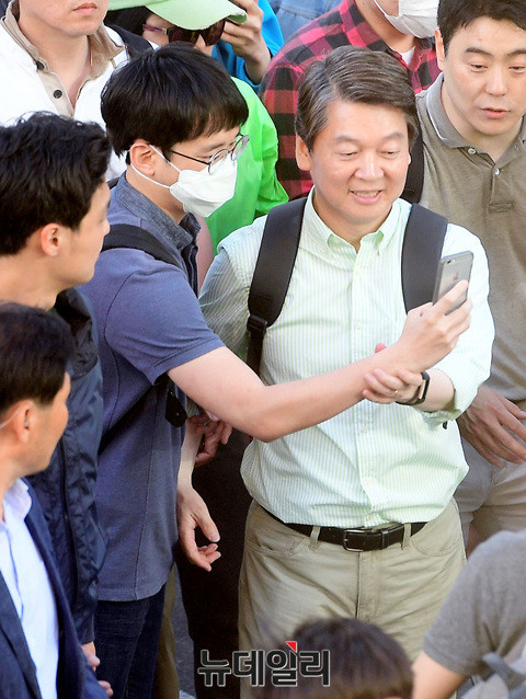 안철수 국민의당 대선후보가 7일 오후 강남역에 도착해 시민과 사진을 촬영하고 있다. 안 후보는 앞서 강원도 강릉 산불 피해주민 대피소를 방문 후 잠실역에서 '걸어서 국민속으로' 도보유세를 시작했다. 이어 홍대입구역, 여의도 밤도깨비야시장, 신촌역, 서울역, 용산역, 동대문평화시장에서 유세를 이어갈 예정이다. (사진=공동취재단)