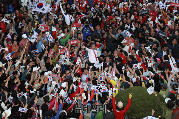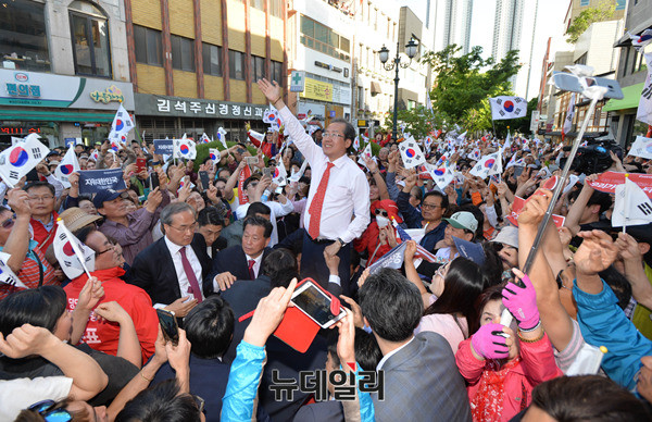 홍준표 자유한국당 대선후보가 7일 오후 울산 중구 장충로 문화의거리에서 열린 유세에서 지지자들의 환호에 손을 들어 화답하고 있다. 홍 후보는 이날 경남·울산·부산을 돌며 PK지역 표심 공략에 나섰다. (울산=뉴데일리 정상윤 기자, 사진=공동취재단)
