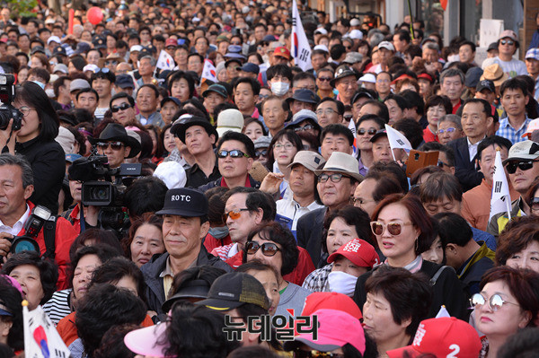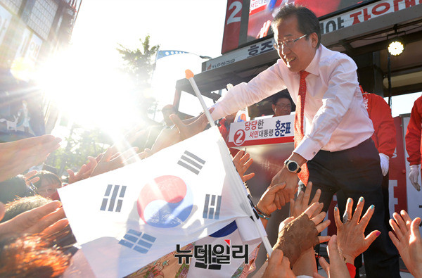 홍준표 자유한국당 대선후보가 7일 오후 울산 중구 장충로 문화의거리에서 열린 유세에서 지지자들에게 큰절을 올리고 있다. 홍 후보는 이날 경남·울산·부산을 돌며 PK지역 표심 공략에 나섰다. (울산=뉴데일리 정상윤 기자, 사진=공동취재단)