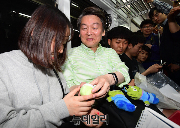 안철수 국민의당 대선후보가 7일 오후 강남역에서 홍대입구역까지 지하철을 타고 이동하며 시민에게 인형을 선물하고 있다. 안 후보는 앞서 강원도 강릉 산불 피해주민 대피소를 방문했다. 이어 홍대입구역, 여의도 밤도깨비야시장, 신촌역, 서울역, 용산역, 동대문평화시장에서 도보유세를 이어갈 예정이다. (사진=공동취재단)