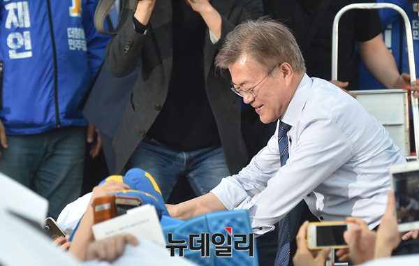 더불어민주당 문재인 대선후보가 7일 오후 광주송정역 광장에서 열린 집중유세를 마친 뒤 지지자들과 악수하고 있다.