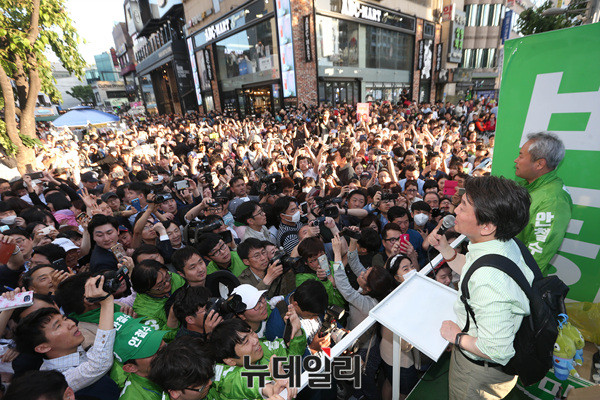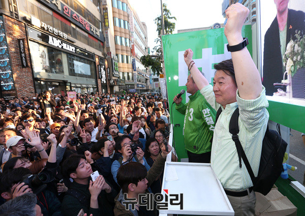 안철수 국민의당 대선후보가 7일 오후 서울 홍대입구역에서 지지를 호소하고 있다. 안 후보는 앞서 강원도 강릉 산불 피해주민 대피소를 방문했다. 이어 여의도 밤도깨비야시장, 신촌역, 서울역, 용산역, 동대문평화시장에서 도보유세를 이어갈 예정이다. (사진=공동취재단)