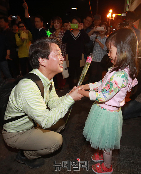 안철수 국민의당 대선후보가 7일 오후 서울 신촌 유플렉스에서 한 아이에게 장미꽃을 선물 받고 있다. 안 후보는 앞서 강원도 강릉 산불 피해주민 대피소를 방문했다. 이어 서울역, 동대문평화시장에서 도보유세를 이어갈 예정이다. (사진=공동취재단)