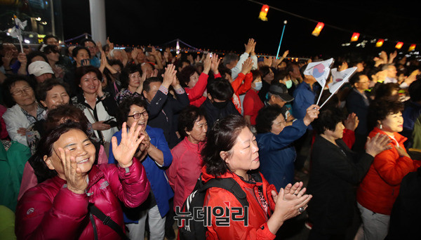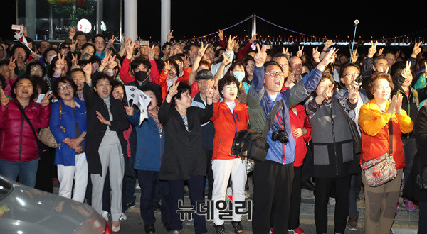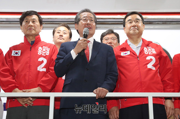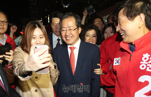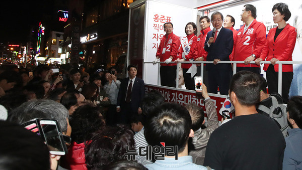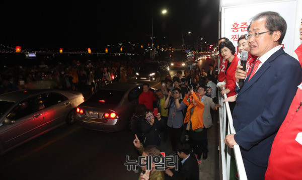 홍준표 자유한국당 대선 후보가 7일 오후 부산 수영구 광안리해수욕장 호안도로에서 거리 선거 유세에 나서 지지를 호소하고 있다. 홍 후보는 이날 부산·울산·경남 지역에서 표심을 공략했다. (부산=뉴데일리 정상윤 기자, 사진=공동취재단)