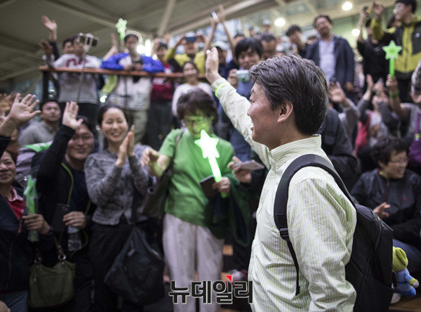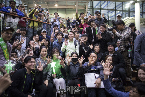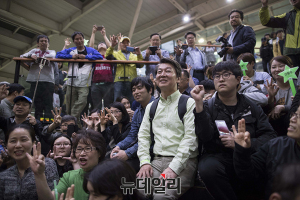 안철수 국민의당 대선후보가 7일 오후 서울역에서 시민들과 사진 촬영하고 있다. 안 후보는 앞서 강원도 강릉 산불 피해주민 대피소를 방문했다. 이어 동대문평화시장에서 도보유세를 이어갈 예정이다. (사진=공동취재단)