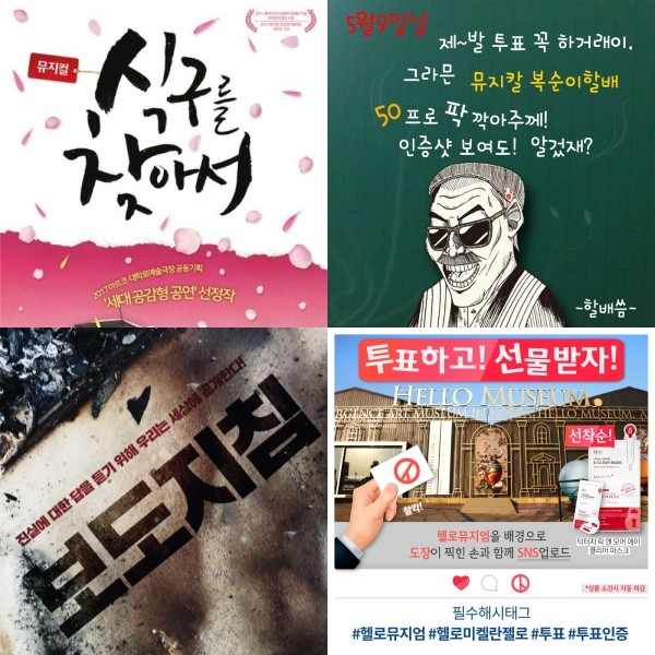 문화계가 오는 9일 제19대 대통령 선거일을 앞두고 투표 마케팅에 한창이다. 투표 인증샷을 가지고 극장을 찾으면 현재 공연중인 연극, 뮤지컬 등의 작품을 대폭 할인해주는 다양한 혜택을 내걸며 관객 표심 몰이에 나선 것.