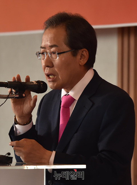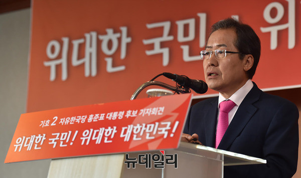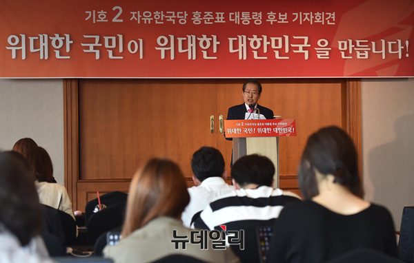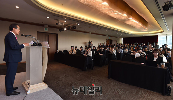 홍준표 자유한국당 대선후보가 공식선거 유세 마지막날인 8일 오전 부산 해운대그랜드호텔에서 대국민 기자회견을 열고 회견문을 발표하고 있다. 다음은 기자회견문 전문이다. (부산=뉴데일리 정상윤 기자, 사진=공동취재단)