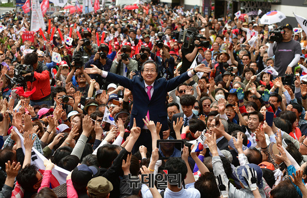 홍준표 자유한국당 대선후보가 선거 유세 마지막 날인 8일 오후 대구 중구 반월당 동아쇼핑 앞 광장에서 연설 직후 지지자들에게 손을 들어 화답하고 있다. 홍 후보는 이날 부산을 시작으로 대구를 찾았다. 이어 대전과 천안에서 거점유세를 이어간다. 또 태극기 집회가 몇 개월간 열린 대한문을 찾아 마지막 대규모 유세를 이어갈 예정이다. 오후 8시부터 강남역과 홍대입구역을 찾아 거리유세로 시민들을 만나며 22일간 공식 선거운동을 마무리 한다. (대구=뉴데일리 정상윤 기자)