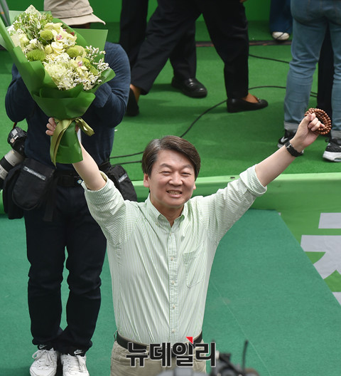 안철수 국민의당 대선후보가 19대 대선을 하루 앞둔 8일 오전 서울 광화문 세종문화회관 앞에서 열린 집중유세에서 손을 들어 지지를 호소하고 있다.