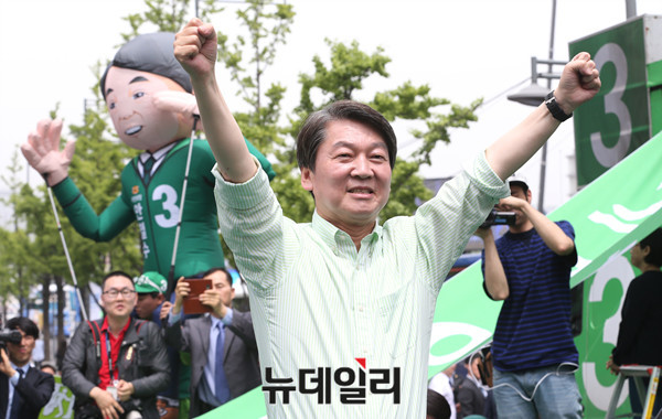 안철수 국민의당 대선후보가 19대 대선 투표일을 하루 앞둔 8일 오후 서울 광화문 세종문화회관 앞에서 열린 유세에서 팔을 들어 지지자들에게 인사하고 있다.