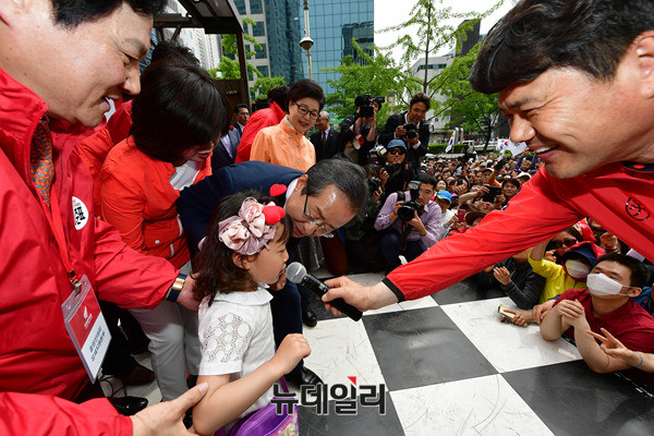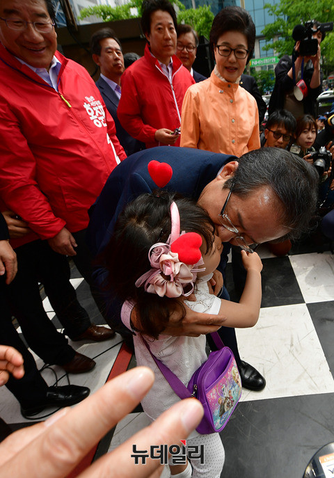 홍준표 자유한국당 대선후보가 선거 유세 마지막 날인 8일 오후 대구 중구 반월당 동아쇼핑 앞 광장에서 연설 직후 어린이 볼에 입맞춤을 하고 있다. 홍 후보는 "TK(대구·경북)에는 박근혜는 가고, 홍준표가 있다"며 "홍준표를 중심으로 새로 뭉치자"고 말했다. "홍준표가 되면 박근혜의 억울함이 없어진다"고 했다. 이날 유세장에는 박근혜 전 대통령의 동생 박근령 씨가 참석했다.