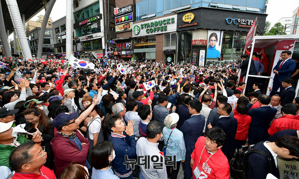 부산을 시작으로 대구를 찾은 홍후보는 대전과 천안에서 거점유세를 이어갔다. 또 태극기 집회가 몇 개월간 열린 대한문을 찾아 마지막 대규모 유세를 이어갈 예정이다. 오후 8시부터 강남역과 홍대입구역을 찾아 거리유세로 시민들을 만나며 22일간 공식 선거운동을 마무리 한다. (대전=뉴데일리 정상윤 기자)