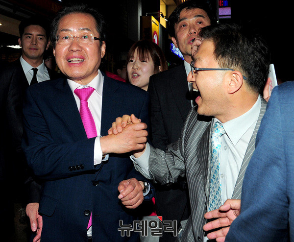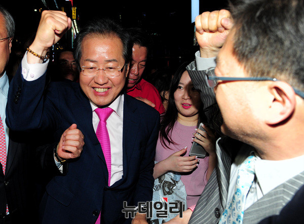 홍준표 자유한국당 대선후보가 선거를 하루 앞둔 8일 오후 서울 강남역 앞에서 시민과 화이팅을 외치고 있다. 홍 후보는 앞서 대한문에서 유세에 나섰다. 이어 홍대에서 시민들과 만날 예정이다.