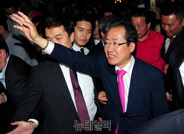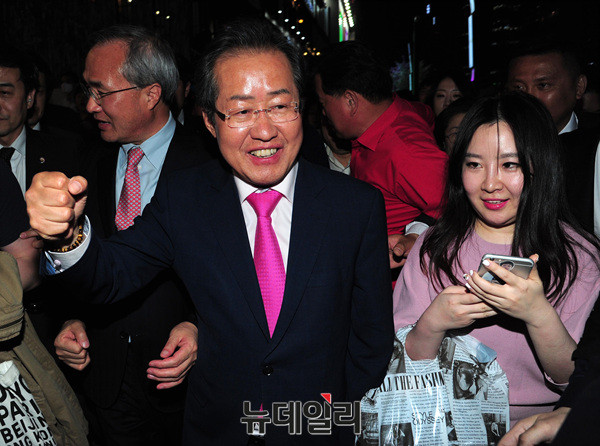 홍준표 자유한국당 대선후보가 선거를 하루 앞둔 8일 오후 서울 강남역 앞에서 시민들을 향해 손을 흔들고 있다. 홍 후보는 앞서 대한문에서 유세에 나섰다. 이어 홍대에서 시민들과 만날 예정이다.