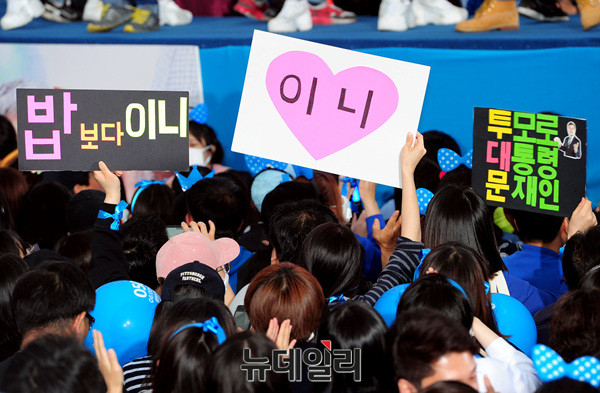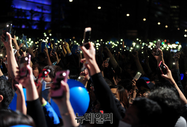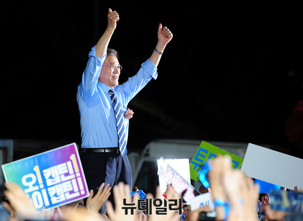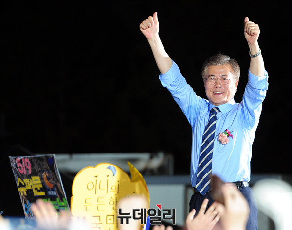 문재인 더불어민주당 대선후보가 선거를 하루 앞둔 8일 오후 서울 광화문광장에서 만세를 하고 있다. 문 후보는 앞서 부산, 대구, 청주에서 유세를 가졌다.