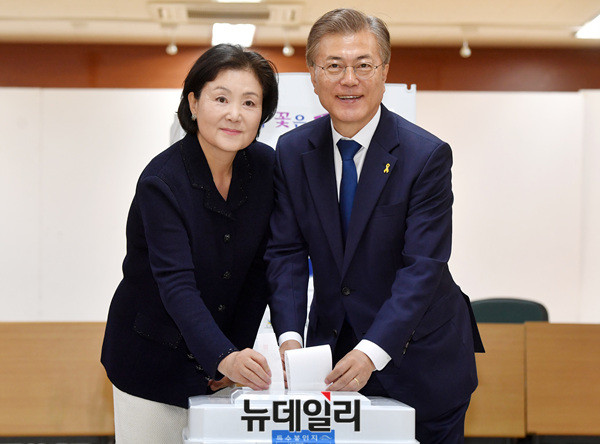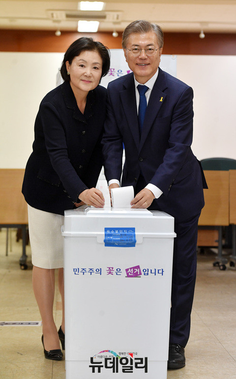 문재인 더불어민주당 대선후보와 부인 김정숙씨가 9일 오전 서울 서대문구 홍은2동 제3투표소인 홍은중학교에서 투표를 하고 있다. (사진=공동취재단)