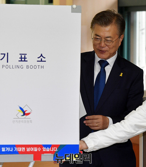 문재인 더불어민주당 대선후보가 9일 오전 서울 서대문구 홍은2동 제3투표소인 홍은중학교에서 투표를 위해 기표소로 들어가고 있다. (사진=공동취재단)
