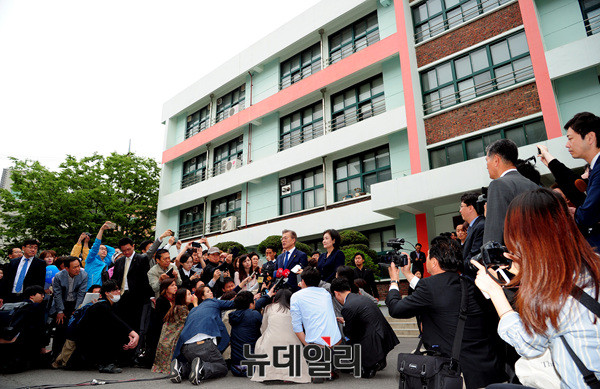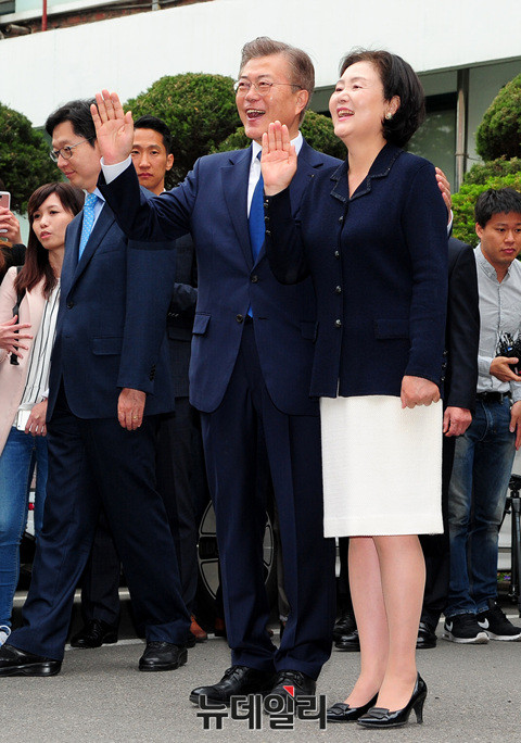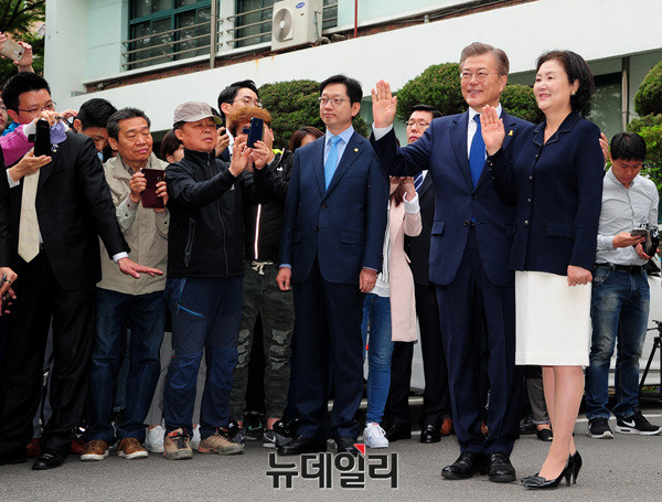 문재인 더불어민주당 대선후보와 부인 김정숙씨가 9일 오전 서울 서대문구 홍은2동 제3투표소인 홍은중학교에서 투표를 마치고 손을 흔들고 있다.