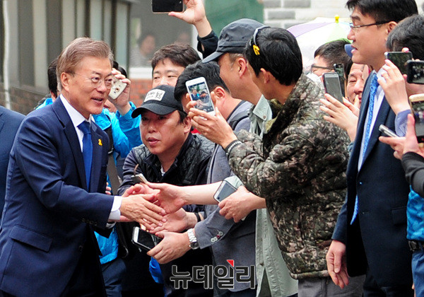 문재인 더불어민주당 대선후보가 9일 오전 서울 서대문구 홍은2동 제3투표소인 홍은중학교에서 시민들과 악수를 나누고 있다.