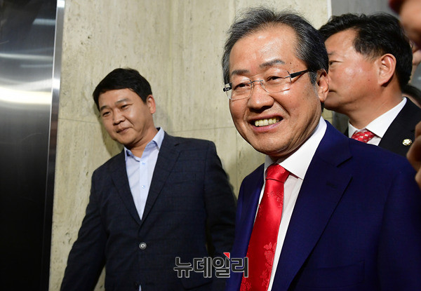 홍준표 자유한국당 대선후보가 9일 오후 출구조사 발표후 9시 15분께 서울 영등포구 자유한국당사에 입장하고 있다. 앞서 홍 후보는 경남 창녕군에 위치한 선친 묘지를 참배했다.