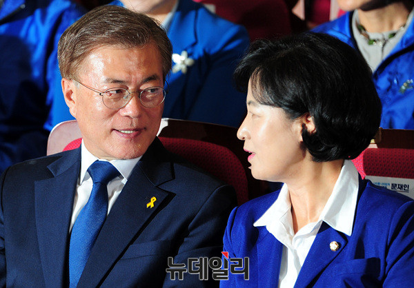 문재인 더불어민주당 대선후보와 추미애 공동선대위원장이 9일 오후 국회 의원회관 개표상황실에서 대화를 나누고 있다. 이날 발표된 출구조사는 문재인 41.4%, 홍준표 23.3%, 안철수 21.8%, 유승민 7.1%, 심상정 5.9%로 발표됐다.