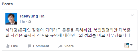 바른정당 하태경 의원이 더불어민주당 문재인 대선후보의 아들 문준용 씨의 특혜취업에 대해 진실을 규명하겠다고 나섰다.제19대 대통령 선거 투표가 종료되고 출구조사 결과가 나온 후 하태경 의원이 자신의 페이스북에 이런 메시지를 남겼다.하 의원은 개표가 시작된 오후 9시쯤 페이스북을 통해 "문재인 정권이 되더라도 문준용 특혜취업, 북인권결의안 대북문제의 사건을 끝가지 진실 규명해 대한민국 정의를 바로 세우겠다"고 적었다.글을 올린 지 1시간 만인 오후 10시 기준으로 해당 포스트에는 좋아요 205개가 달렸고 52명이 댓글을 달았다. 댓글 중에는 △"꼭 진실을 밝혀주세요" △"잘못된 건 잡아야 된다고 생각합니다" △"공정한 룰 아래에서 아이들을 키우게 해주세요" 등 응원하는 글들이 보였다.문준용 씨는 노무현 정부 때인 2006년 12월 한국고용정보원 5급 일반직에 채용되는 과정에서 특혜를 받았다는 의혹을 받아왔다. 서류 접수가 마감된 후에 응시원서를 제출했고 2명을 뽑는 데 2명이 지원했으며 채용 당시 채점표 원본이 삭제됐다는 주장도 나왔다.국민의당은 문준용 씨의 채용특혜를 뒷받침할 만한 음성 파일을 공개하는 등 공세를 펴왔다.한편 방송 3사의 출구조사 결과 문재인 대선후보가 득표율 41.4%를 기록해 선두에 올랐다. 그 다음으로 자유한국당 홍준표 후보(23.3%), 국민의당 안철수(21.8%), 바른정당 유승민(7.1%) 등 순이었다.
