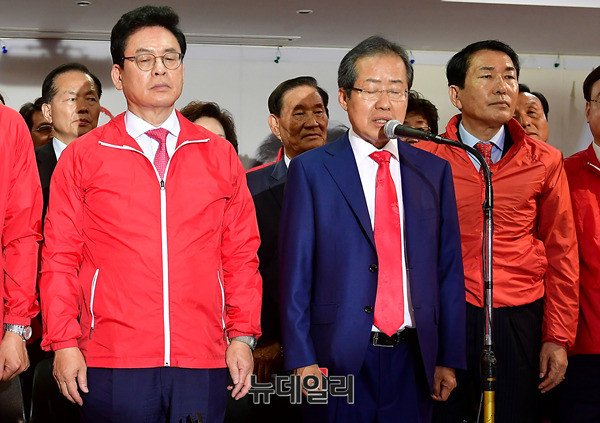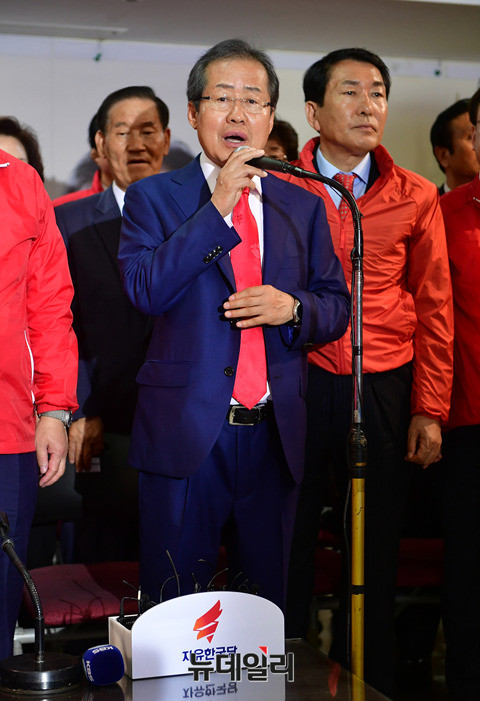 홍준표 자유한국당 대선후보가 9일 오후 서울 여의도 당사에 마련된 상황실에서 입장을 밝히고 있다. 홍 후보는 "출구조사 결과가 사실이라면 자유한국당을 복원한 것에 만족한다"고 밝혔다.