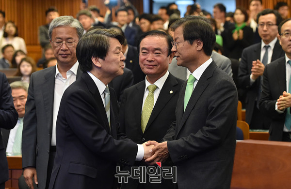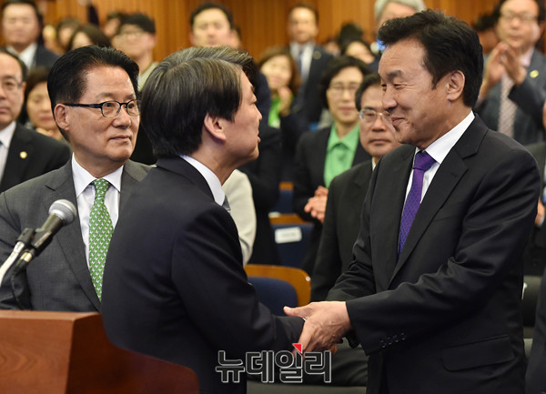 안철수 국민의당 대선후보가 9일 오후 국회 헌정기념관에 마련된 국민의당 선대위 개표상황실을 찾아 박지원 대표, 주승용 원내대표 및 소속의원, 당직자를 위로하고 있다.