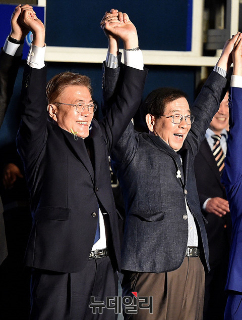 문재인 대통령 당선인이 박원순 서울시장과 9일 오후 서울 종로구 세종로공원에서 열린 시민들과 함께하는 개표방송에서 손을들어 인사하고 있다.