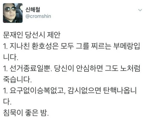 고인은 "선거 종료일 뿐, 당신이 안심하면 그(문재인 후보)도 노(故 노무현 전 대통령)처럼 죽는다"고 경고한 뒤 "요구 없이 승복 없고, 감시 없으면 탄핵 나온다"는 말로, '당선자를 감시·관찰하는 유권자의 본분을 잊어선 안된다'고 강조했다.