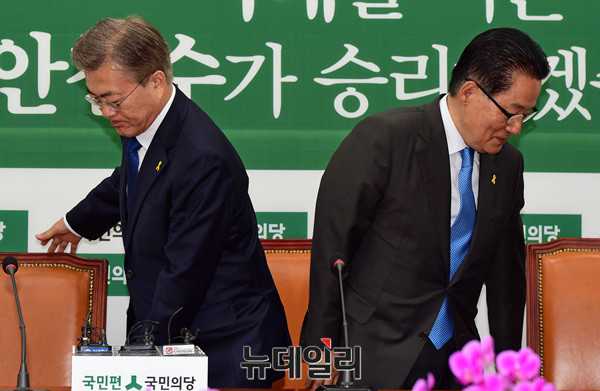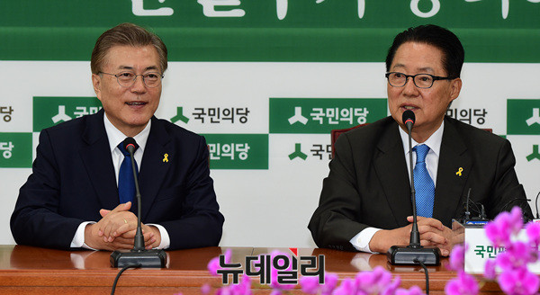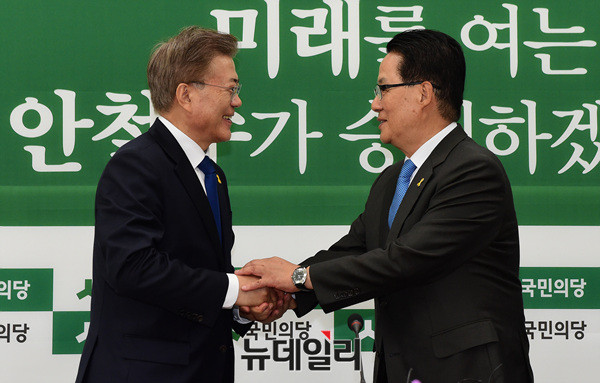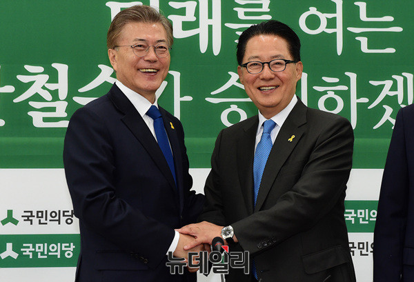 제19대 대통령에 취임한 문재인 대통령이 10일 오전 국회 국민의당 대표실에서 박지원 대표와 악수를 나누고 있다. 이후 문 대통령은 청와대 춘추관에서 국무총리, 국정원장, 비서실장, 경호실장 인선을 발표했다. (사진=공동취재단)