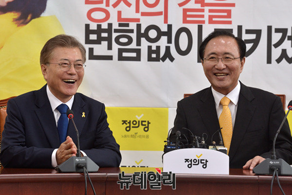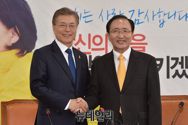 제19대 대통령에 취임한 문재인 대통령이 10일 오전 정의당 대표실에서 노회찬 원내대표와 대화를 나누고 있다. 이후 문 대통령은 청와대 춘추관에서 국무총리, 국정원장, 비서실장, 경호실장 인선을 발표했다. (사진=공동취재단)