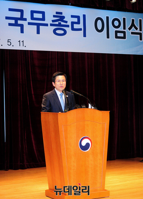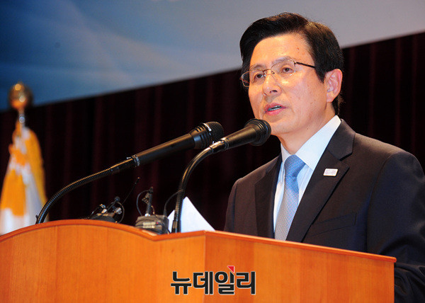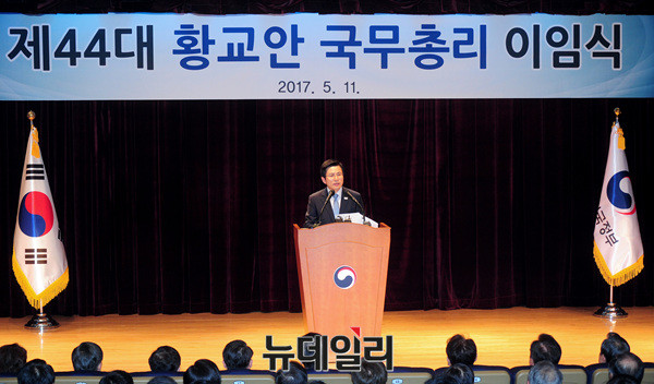 황교안 국무총리가 11일 오후 정부서울청사 별관에서 열린 이임식에서 이임사를 하고 있다. 황 총리는 지난해 12월 박근혜 전 대통령에 대한 국회 탄핵소추안이 가결된 이후부터 문재인 대통령이 취임하기 전까지 대통령 권한대행을 맡아 국정을 운영해 왔다.