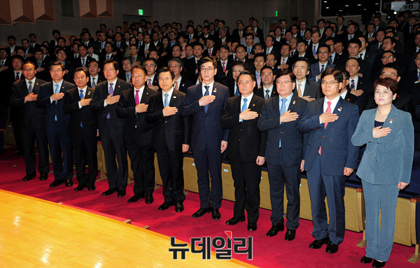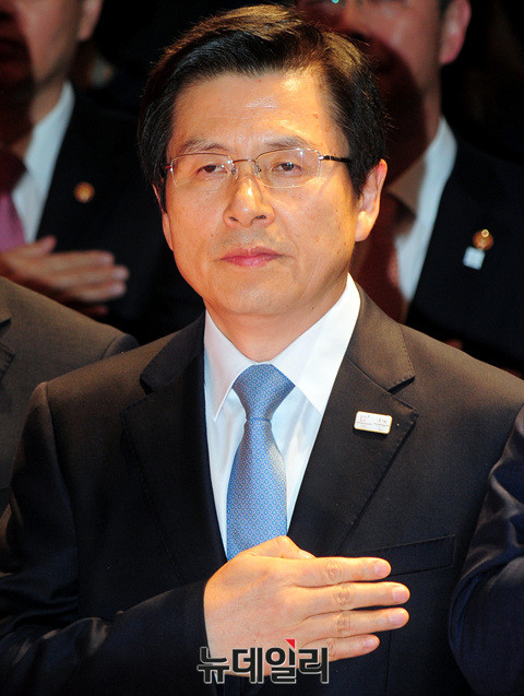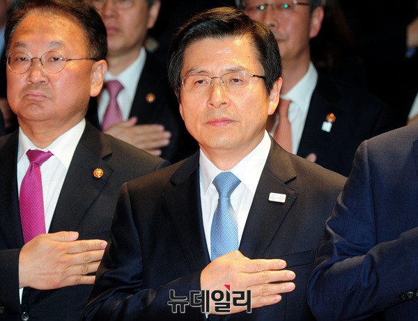 황교안 국무총리가 11일 오후 정부서울청사 별관에서 열린 이임식에서 국민의례를 하고 있다. 황 총리는 지난해 12월 박근혜 전 대통령에 대한 국회 탄핵소추안이 가결된 이후부터 문재인 대통령이 취임하기 전까지 대통령 권한대행을 맡아 국정을 운영해 왔다.