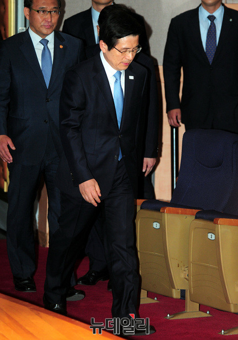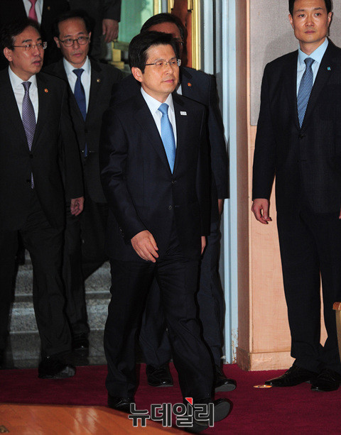황교안 국무총리가 11일 오후 정부서울청사 별관에서 열린 이임식에 입장하고 있다. 황 총리는 지난해 12월 박근혜 전 대통령에 대한 국회 탄핵소추안이 가결된 이후부터 문재인 대통령이 취임하기 전까지 대통령 권한대행을 맡아 국정을 운영해 왔다.