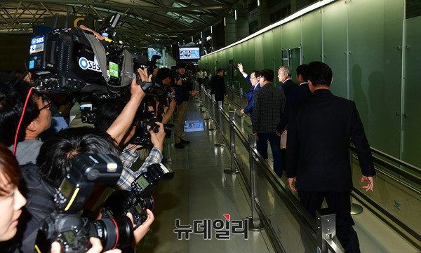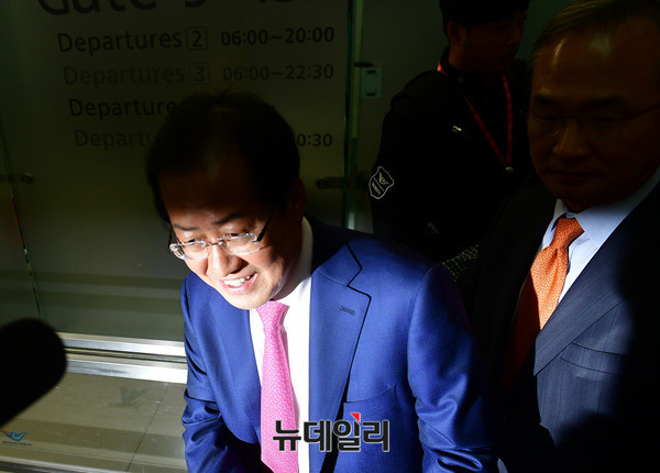 홍준표 자유한국당 전 대선후보가 12일 오후 인천국제공항에서 LA행 비행기에 탑승하기 위해 출국장으로 입장하며 손을 들어 화답하고 있다. 홍 전 후보 내외는 차남 정현 씨 부부가 있는 미국으로 출국해 한 달 정도 머무를 것으로 전해졌다.