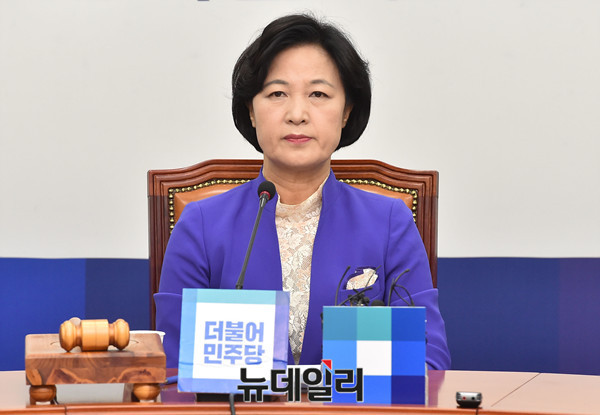 추미애 더불어민주당 대표가 15일 오전 국회 당대표회의실에서 열린 최고위원회의에서 발언을 하고 있다.