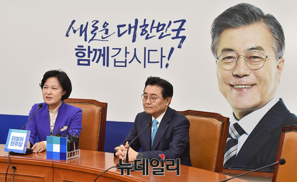 전병헌 신임 정무수석이 15일 오전 국회 더불어민주당을 찾아 추미애 대표를 예방해 대화를 나누고 있다.