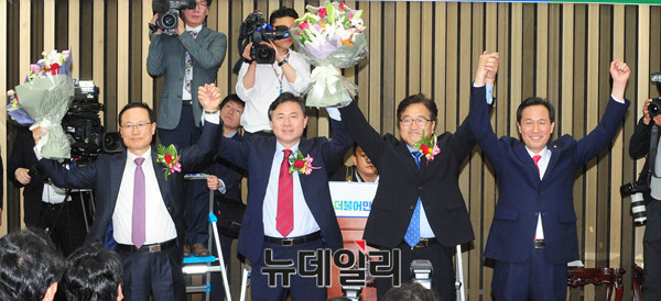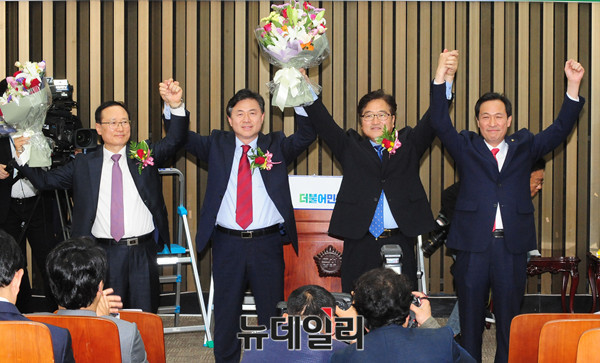 더불어민주당 신임 원내대표에 선출된 우원식 원내대표가 16일 국회에서 열린 더불어민주당 차기 원내대표 선거에서 당선된 후 꽃다발을 들어 인사하고 있다.