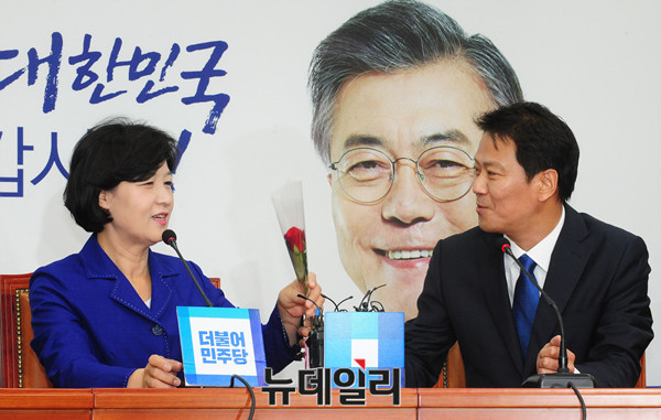 추미애 더불어민주당 대표가 16일 오전 국회 당대표실을 찾은 임종석 대통령 비서실장을 만나 인사를 나누고 있다.