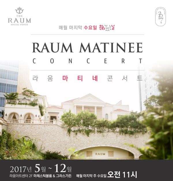 국내 최초 소셜 베뉴 라움아트센터가 마티네 콘서트를 오픈한다.라움아트센터는 오는 31일부터 12월까지 매월 마지막 주 수요일 오전 11시에 마제스틱 볼룸과 그라스 가든에서 마티네 콘서트를 연다.31일 첫 번째 마티네 콘서트는 '봄 날의 향기를 전하는 영화 음악'을 주제로 서울팝스스트링 앙상블이 특별한 시간을 선물한다.서울팝스오케스트라의 스트링 앙상블은 '라라랜드'의 메인 테마곡부터 '사운드 오브 뮤직', '냉정과 열정사이' 등 전 세계적으로 사랑받는 영화 음악을 라움의 아름다운 공간에서 들려준다.프리랜서 아나운서 박준수의 사회로 진행되는 라움아트센터의 마티네 콘서트는 6월과 7월엔 팝페라, 8월은 재즈 앙상블을 주제로 한 색다른 공연을 선보일 계획이다.9월과 10월에는 '가을과 소통하는 클래식'을 주제로 쉽게 접할 수 없는 다양한 악기를 소개하며, 11월과 12월에는 부담 없는 문화송년회를 위해 현악 4중주와 브라스 밴드의 풍성한 음악을 준비하고 있다.라움아트센터는 고품격 공연을 준비하고, 스테이크가 포함된 셰프 특선의 브런치 뷔페 패키지를 합리적인 가격으로 제공해 보다 많은 관객들에게 색다른 문화 혜택을 선사할 예정이다라움의 마티네 콘서트는 인터파크에서 예매할 수 있다. 티켓 가격 2만~3만원. 패키지 할인 4만5천~5만5천원. 문의 02-538-3366.