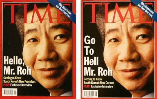 원래 노무현 전 대통령의 표지 사진에는 "Hello, Mr.Roh" "Getting to Know South Korea's New President"라는 카피 문구가 쓰여 있었으나, '캐리돌뉴스'에 등장한 표지 사진에는 "Go To Hell Mr.Roh(지옥에 가라 미스터 노)" "New Corpse(새로운 시체)"라는 장난글이 게재돼 있었다. -