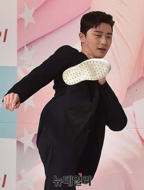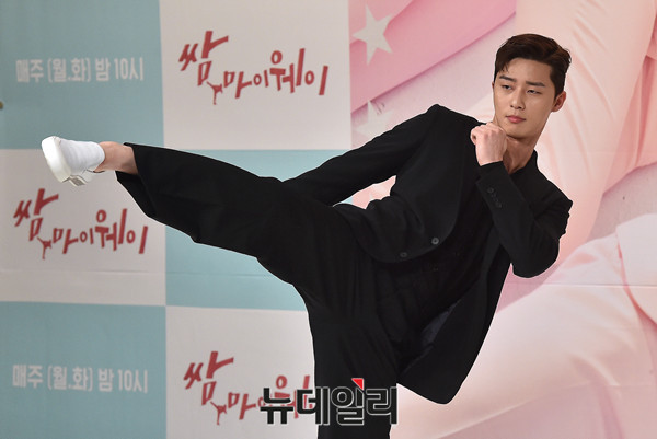 연기자 박서준 18일 오후 서울 영등포 타임스퀘어에서 열린 KBS2 새 월화 드라마 '쌈 마이웨이' 제작발표회에서 포토타임에서 발차기 포즈를 취하고 있다.