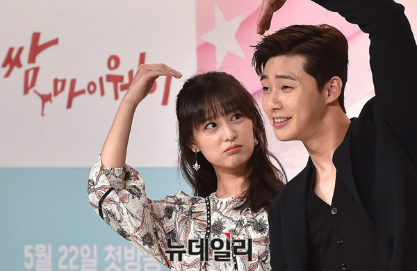 연기자 박서준, 김지원이 18일 오후 서울 영등포 타임스퀘어에서 열린 KBS2 새 월화 드라마 '쌈 마이웨이' 제작발표회에서 포토타임을 갖고 있다.