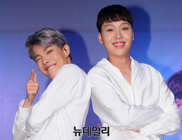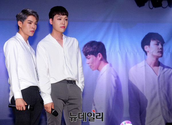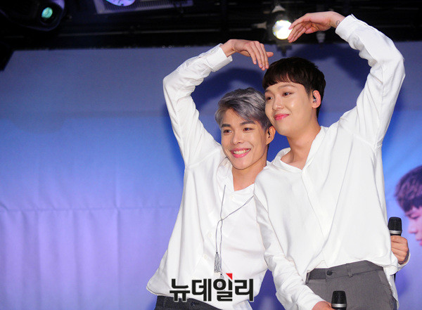 최지빈, 현우빈으로 구성된 듀오 빈블로우(BINBLOW)가 18일 오후 서울 마포구 홍대 롤링홀에서 열린 네 번째 싱글앨범 '아 다르고 어 다른' 발표기념 쇼케이스에 참석해 포토타임을 갖고 있다.