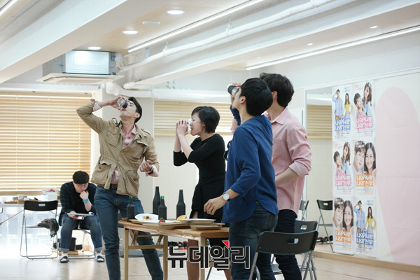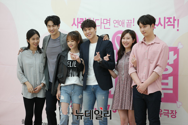배우 신윤정, 김산호, 김보미, 이해준, 이아영, 황찬성(왼쪽부터)이 18일 오후 서울 종로구 자유빌딩 연습실에서 열린 '나의사랑 나의신부(연출 정태영)' 연습실 공개 프레스콜에 참석해 포토타임을 갖고 있다.