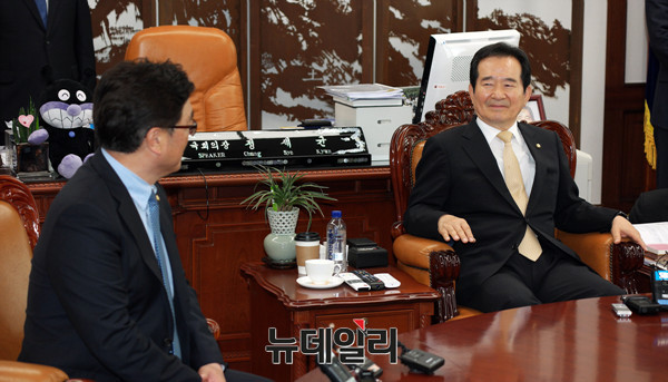 정세균 국회의장이 19일 오전 서울 국회 의장실을 찾은 우원식 더불어민주당 신임 원내대표를 만나 대화를 나누고 있다.