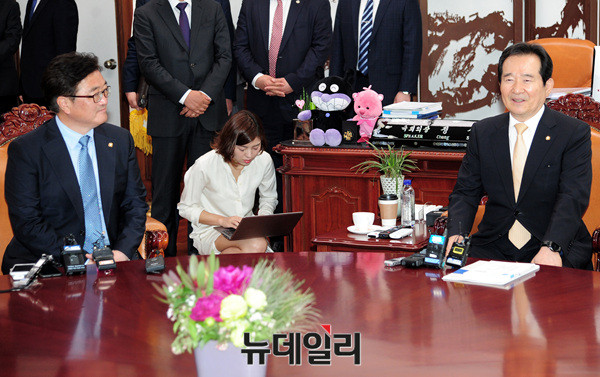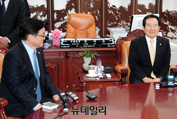 우원식 더불어민주당 원내대표가 19일 오전 국회의장실을 예방해 정세균 국회의장과 대화를 나누고 있다. 이후 우 원내대표는 문재인 대통령과 5당 원내대표 청와대 오찬 회동에 참석할 예정이다.