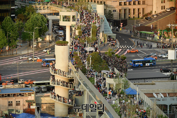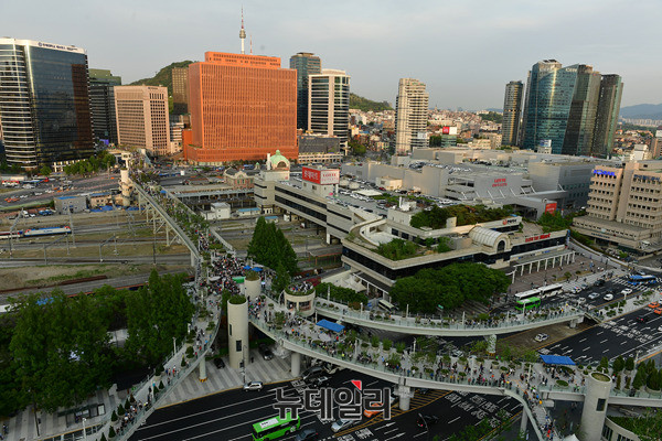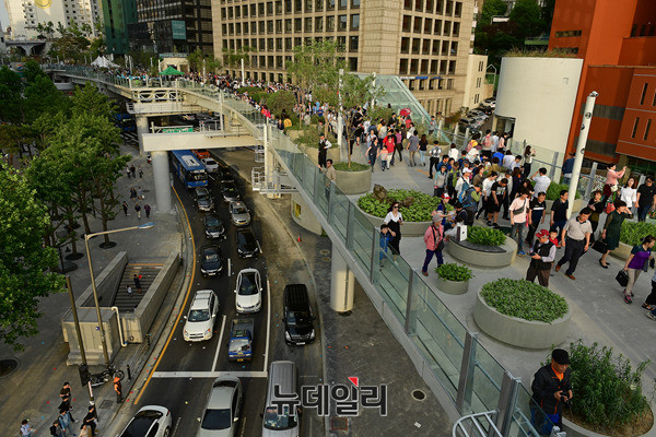 20일 개장한 '서울로 7017'에 시민들이 구경을 하고 있다. 서울로 7017은 과거 45년간 차도로 사용되던 고가도로를 공원형으로 바꾼 보행길이다. 이날 오후 8시부터 만리동광장에는 공식 개장식이 예정돼 있다.