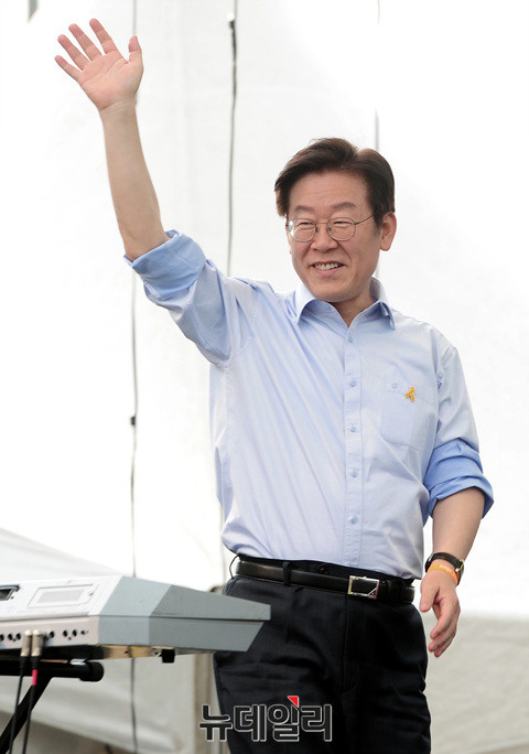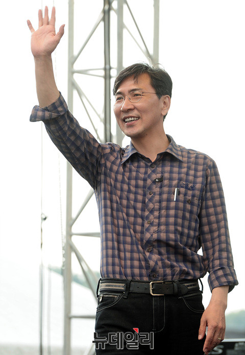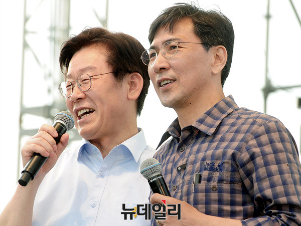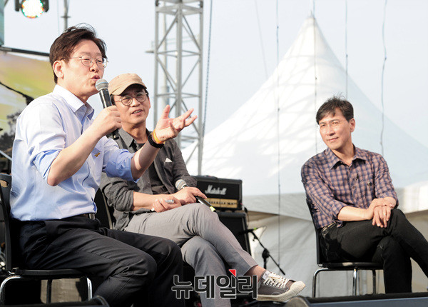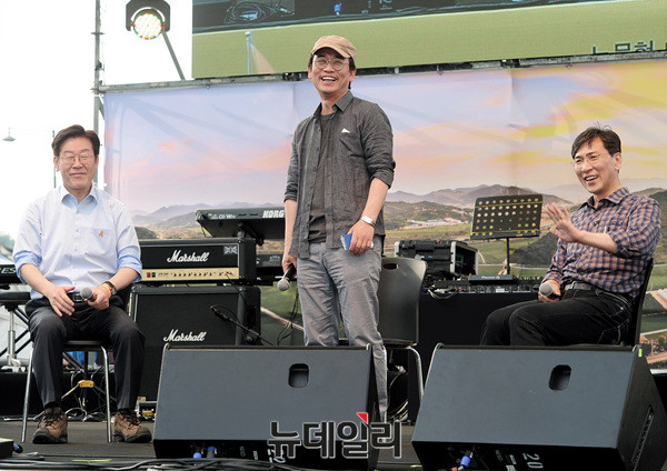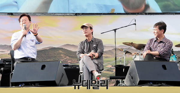 안희정 충남지사, 이재명 성남시장, 유시민 작가가 20일 오후 서울 광화문광장에서 열린 노무현 전 대통령 8주기 추도식 문화제에 참석해 대화를 나누고 있다.